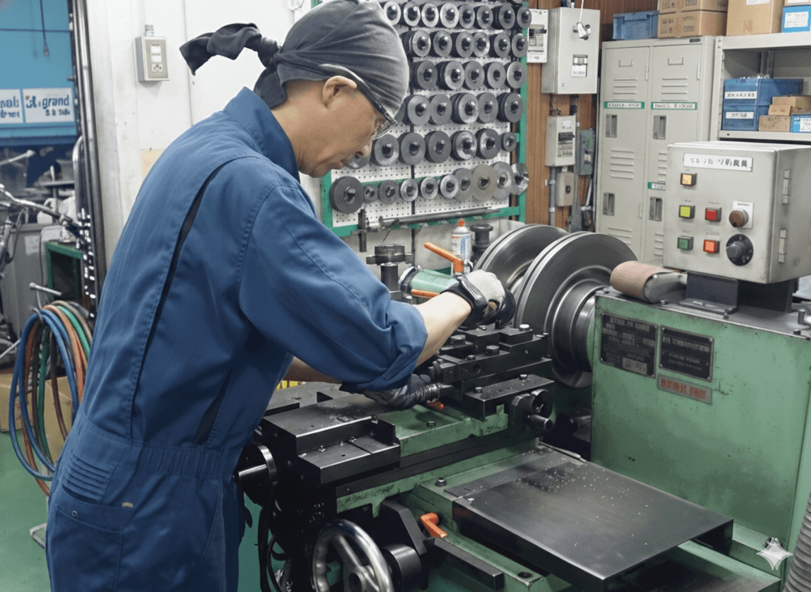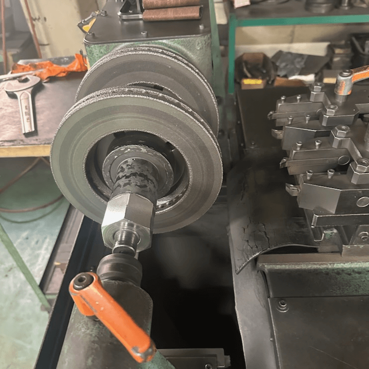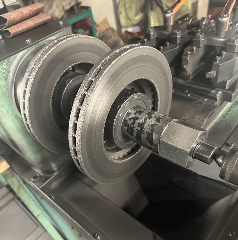 ショットブラストにて錆びを落した後、ディスクローターを研磨機にセットし、研磨を開始します。